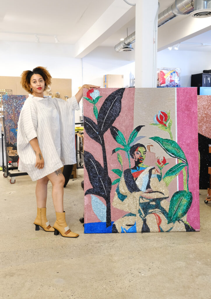 Based in Metro Detroit, Akea Brionne works at the intersection of lens and fiber-based media. Through observations focusing on the African Diaspora, Brionne utilizes emerging technologies, such as artificial intelligence and digital weaving, to translate surreal compositions into multidimensional tapestries adorned with glitter, oil pastels, and rhinestones.