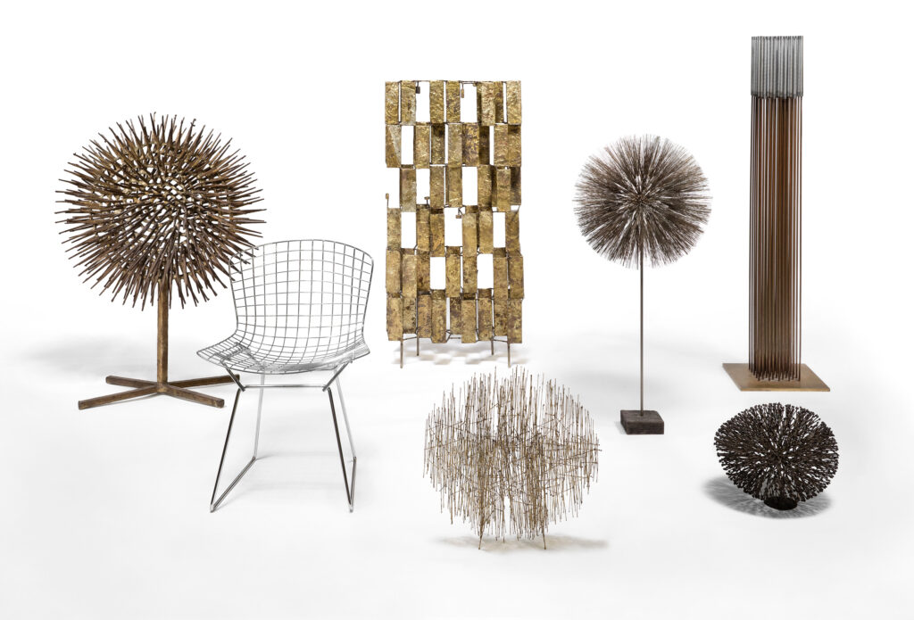 Multiple Harry Bertoia works. From left to right: Untitled (Sunflower), 1956, Bronze; Side chair, designed 1932, steel wire; Untitled (Multi-Plane Construction), Bronze-coated Metal; Untitled, c. 1950-1960s; Untitled (Suflower), c 1960s, steel; Sounding Sculpture, 1978, Beryllium copper and inconel; Untitled (Bush), 1960s, Bronze.
